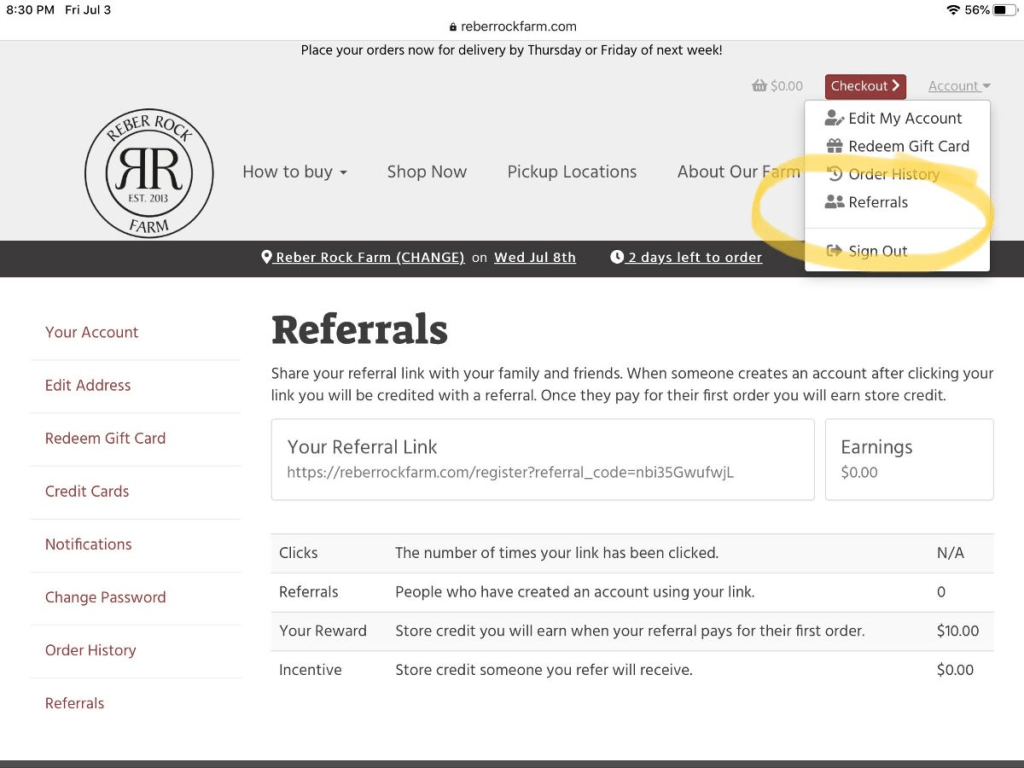 Find your referral link here. Or go to the “Account” menu in the upper right of your screen as pictured above and select “Referrals”. Copy the link and send it to your friends. So help us spread the word, tell them about the SUMMER10 code and they save $10 off their first order. Everyone saves and helps us get to 15 orders!
