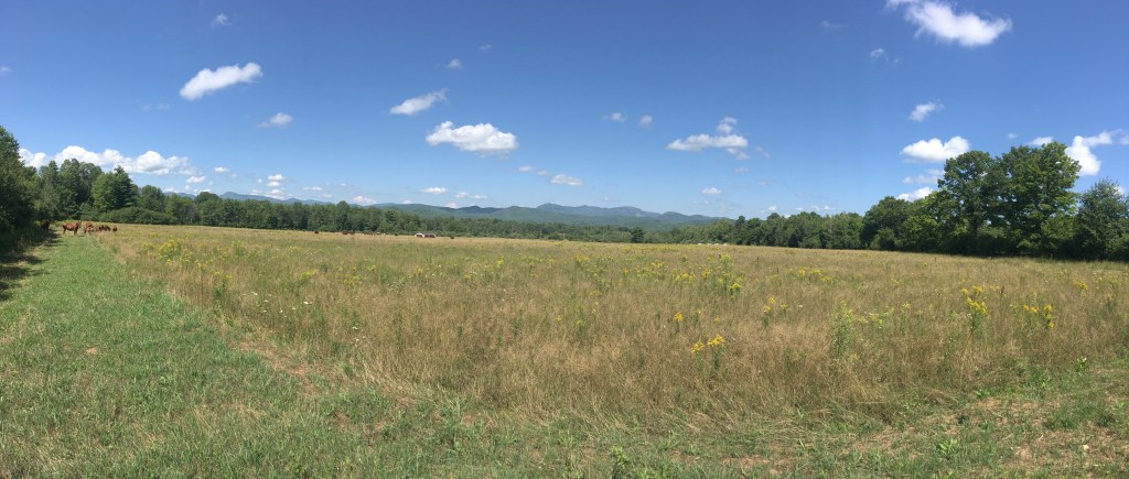 Here’s my picture of this week. Clouds seem like they are out of a painting. If you look closely you can see the 4 small chicken coops to the right, the one big coop in the center, horses to the far left and cattle out towards the large chicken coop. In a way, the photo sums up this summer: clear blue skies, and not much rain. As is evident by the bleached brown hue of the grass across the field. With the exception of the bright green path left by the chicken coop!