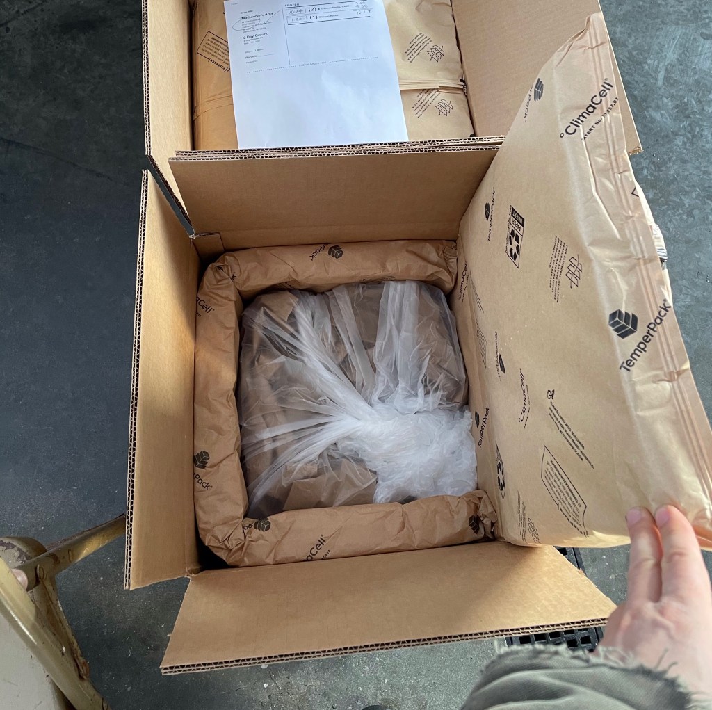 I have one last piece of news this week, which is to introduce you to our new packaging. Packaging consumes a huge amount of resources around the world, and I have loved (and sometimes cursed) the challenge of finding packaging that is both effective at keeping things frozen and will not fill up our landfills. We started the year with box liners that are made of recycled plastic and are curbside recyclable. This is a step up from styrofoam, but plastics are often not recycled even when you put them in the right bin!