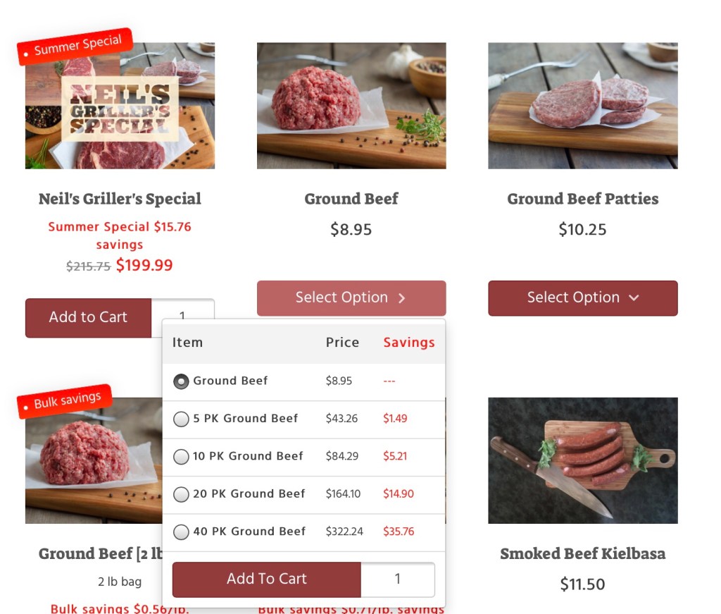 Sitting at a computer, building the back-end of your website is not quite as romantic as moving animals on pasture, but it is a job that needs doing, and I figure February is a good month to do so. I’ve begun rolling out a new feature on our website: a drop down menu under a product, to offer savings the more you buy. Ground Beef for example. We used to offer single 1 lb packages, or a 20 lb box. Now we have a tiered approach, as you can see in the picture, click on the drop down menu and select your level of savings.
