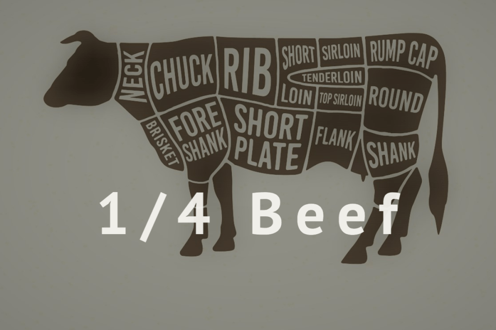 Here’s the way it works: The 1/8 Beef 35lb Box has a pull down menu as well as links in the description for the other 1/4, 1/2 and whole. With each portion of a beef you get a more complete variety of cuts, since there are some cuts (like shoulder tender, or flank) which we only get 2 of per beef and so cannot divide up evenly among a 1/4 or 1/8. We get an average of 400 lbs of meat off of a beef animal and that is enough to fill most chest freezers! So we paired down the 1/8 Beef Box to 35 lbs, but the 1/4, 1/2 and whole beef boxes are 100, 200 and 400 lbs respectively. Depending on your location and delivery preference your price will vary slightly, but we charge a flat price by the lb for these boxes.