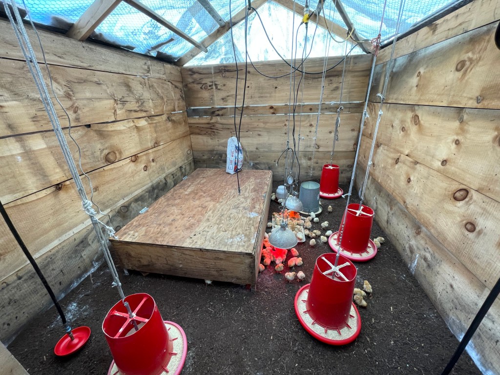 During their first week of life, chicks need temperatures similar to cozying up under a mama hen, which means around 95 degrees Fahrenheit. So we have a box with a layer of insulation in it and some heat bulbs that the chicks can move under to find warmth. They also have food and water under there for easy access, as well as a few hanging heat lamps and feeders outside. With these cold March days we also have a layer of plastic over the top of the brooder to keep the cold wind out. So far everyone looks warm and happy.