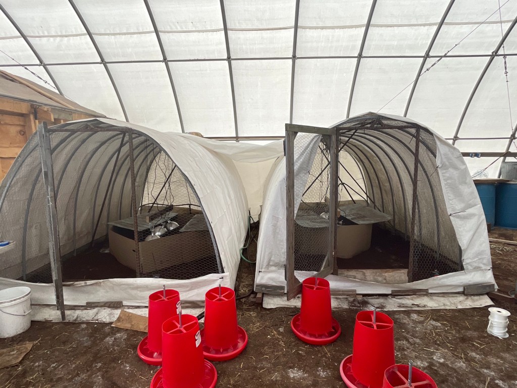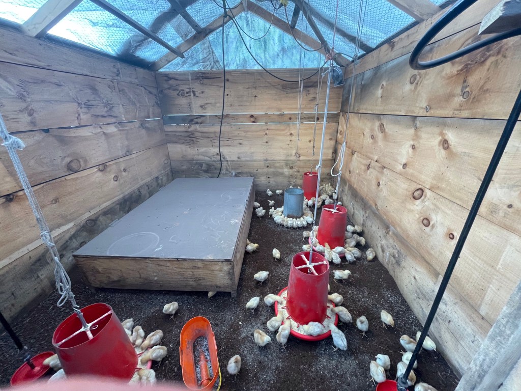 Chicks arriving every two weeks means that we need a second brooder setup. (Chicks do not leave the brooder until they are at least 3 weeks, and these early batches often stay in the brooder past 3 weeks as we wait for a good weather window). So I have been busy figuring out how to keep a second batch of chicks warm. I do not have enough time to build a whole new brooder, or embark on a large project, so I grabbed two of our retired small coops, brought them into the Solar Barn where we keep the chicks, and gave them some heat lamps.