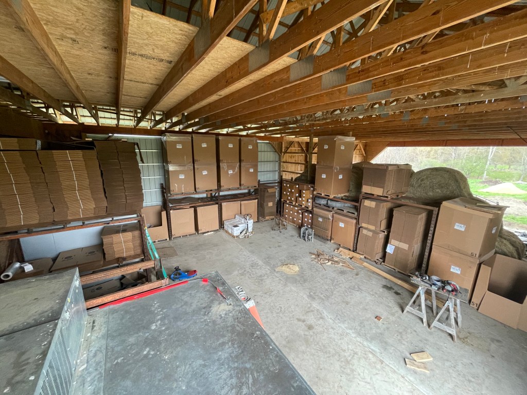 Happy May, and this means spring is in full swing. We’ve had over 4″ of rain so far in April, which started off with complaints of dry weather and has ended with puddles. Spring is also a time for me to get things in order. New systems are created like the new brooders to house more baby chicks at one time. Old systems are dragged back into the sunlight to see what kinks need grease and what needs fixing. With the help of Gampi, we’ve been making use of the rainy days to get all the boxes, box liners, syrup jars, and other assorted inventory sorted in the barn. Our barn ceiling is 16 feet and we’re finally able to make use of that vertical space.