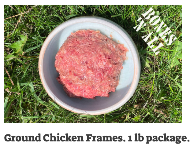 Meet Ground Chicken Frames. These are 1lb bags of our Organic ground chicken, bones, kidneys, fat, skin and some feet. No other ingredients added. The grind is fine, imagine ground beef consistency, and the bone pieces are tiny. While this is a totally food grade product, we recommend feeding it to your feline or canine (or porcine?) friends. Our cattle dog, Susu-Pup, weighs about 80lbs and eats a half pound raw in the morning and evening with his kibbles. Mostly he eats the chicken and leaves the kibbles.