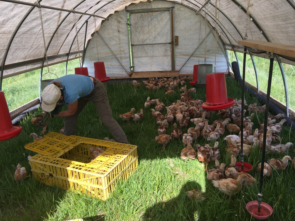 With the arrival of the Covid-19 pandemic and our new online store, Holly transitioned from farmstore and markets to helping with chicken production and order fulfillment. She helps package chicken on processing days, learned to drive the ranger and has moved each and every broiler chick from the brooder out to the field for the last two years. We estimate that Holly has moved at least 8,000 chickens so far; a back of steel.
