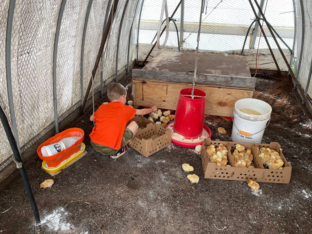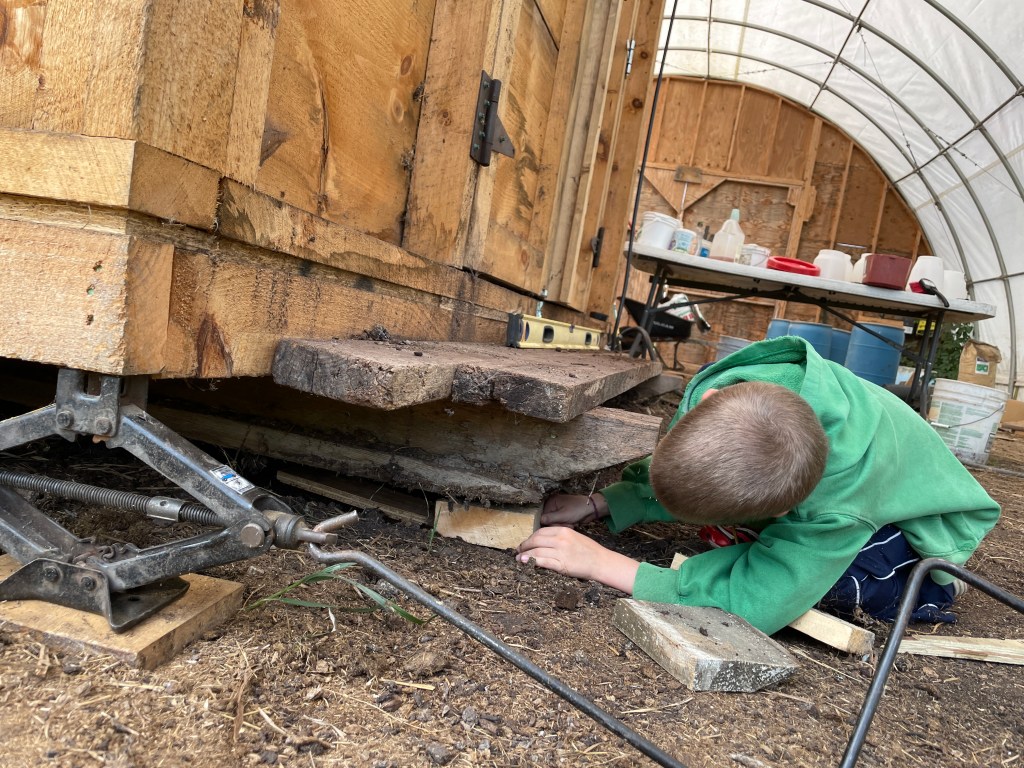 Lewis and I worked on a few farm projects including trying to fix the sticky door to one of the chicken brooders. We suspected a shifting door frame due to not-so-level ground, so we had fun learning about the power of leverage and how to use a level. With a few blocks of wood and a few tries learning how heavy things push blocks into the ground, we were satisfied with our progress. Next we had to prepare for the next batch of chicks arriving.