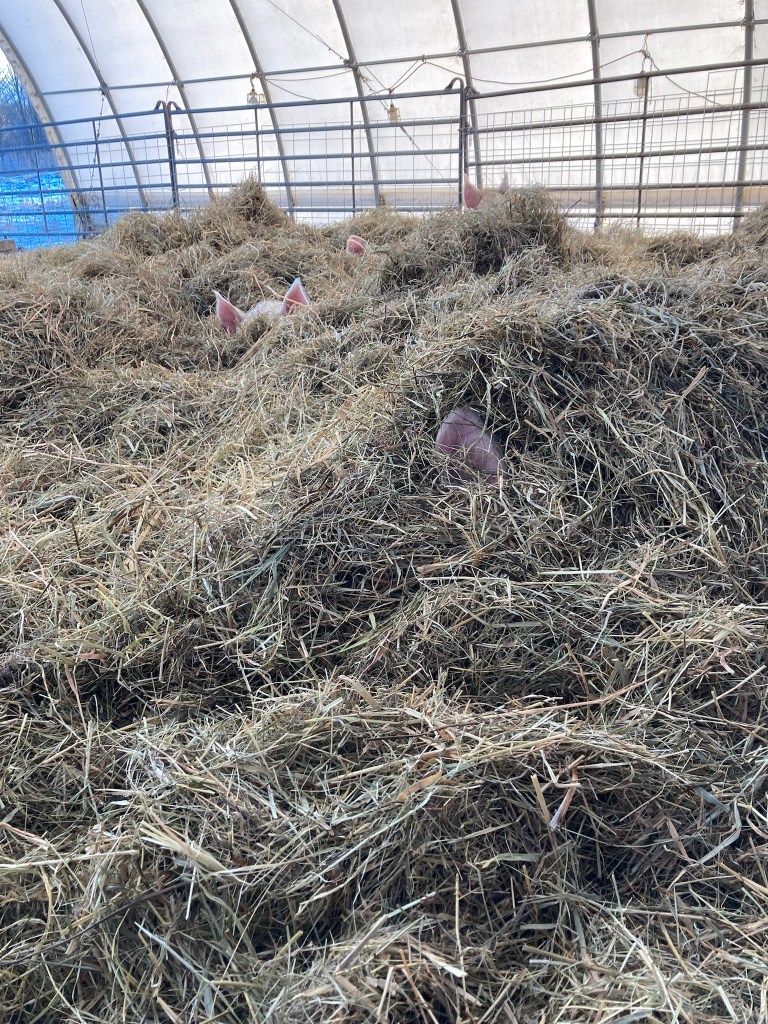 How do animals stay warm outside in -12F? There are a few popular tactics for pigs. I think this picture sums it up.