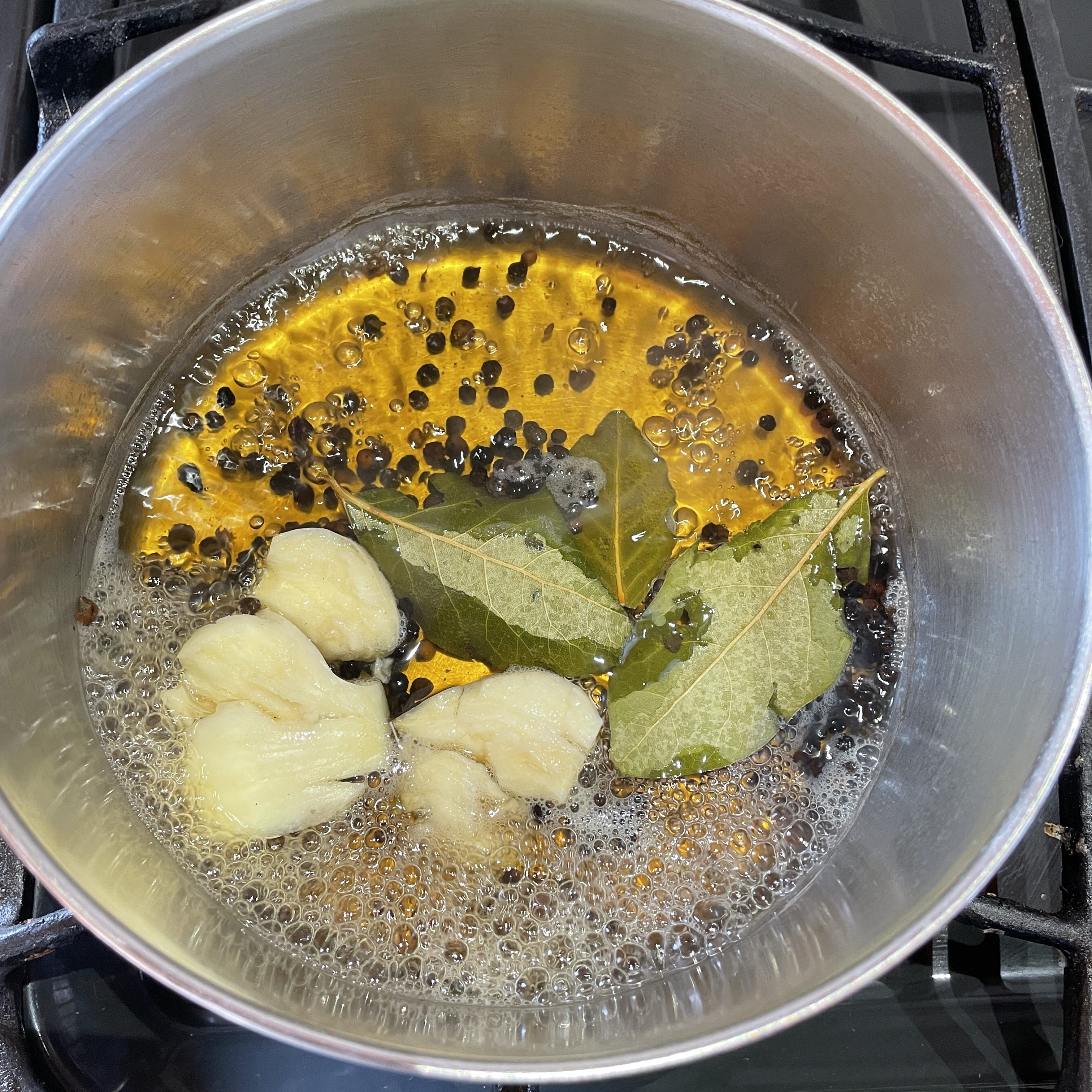 1. From the 1 gallon of water take 2 cups and mix with bay leaves, pepper and garlic in a small sauce pan, bring to a boil and let simmer for 20 mins.