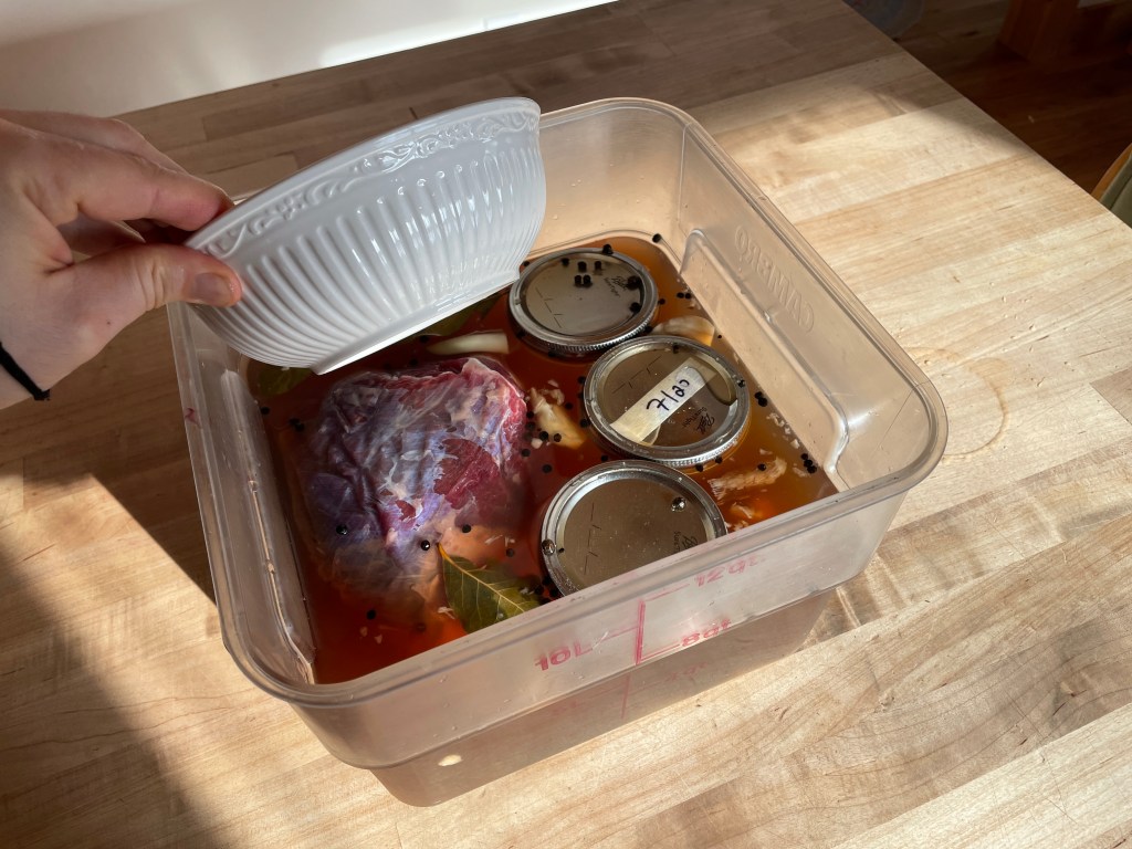 I put the roast in the brine and found that there was not enough brine to cover the roast. So I added some mason jars full of water to my brining container to displace some of the brine so it would cover the roast. A breakfast bowl to weigh the roast down to keep it covered and I’d say it took less than 20 mins to get the roast in the brine with some photo positioning included.