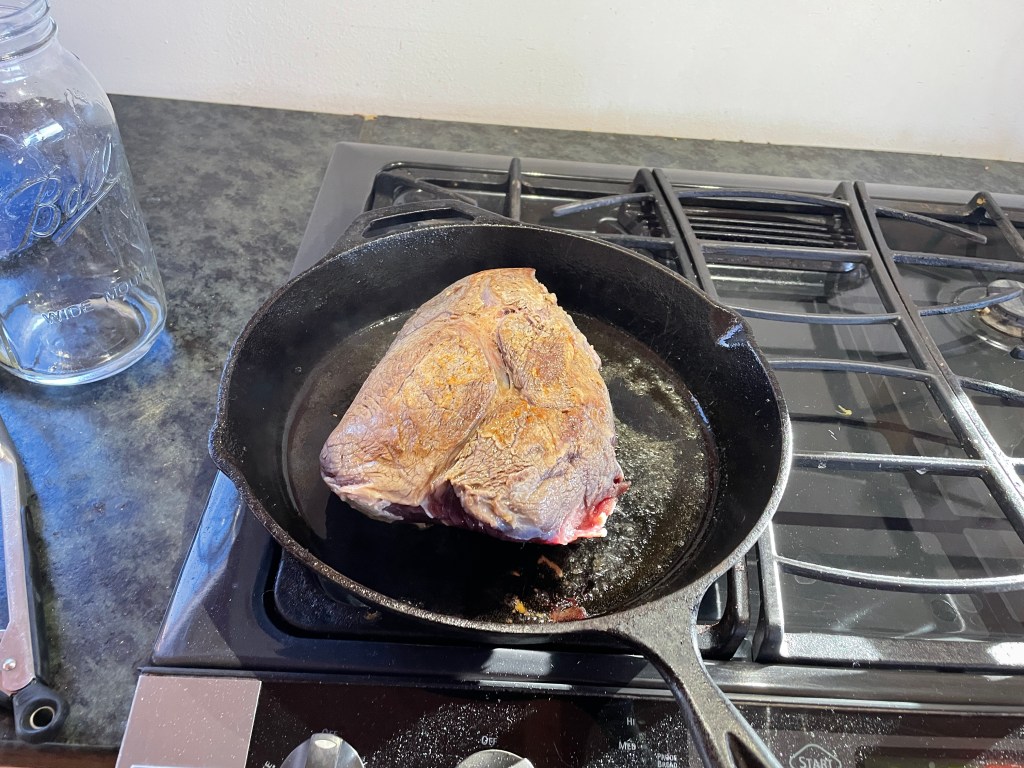 Depending on who you ask, searing a roast has many purposes. For me it is for texture alone. I like a crispy outside and since I was going to employ a slow roast, there will not be much crisp to the outside. So I did a quick sear in the cast iron before putting the roast in the oven.