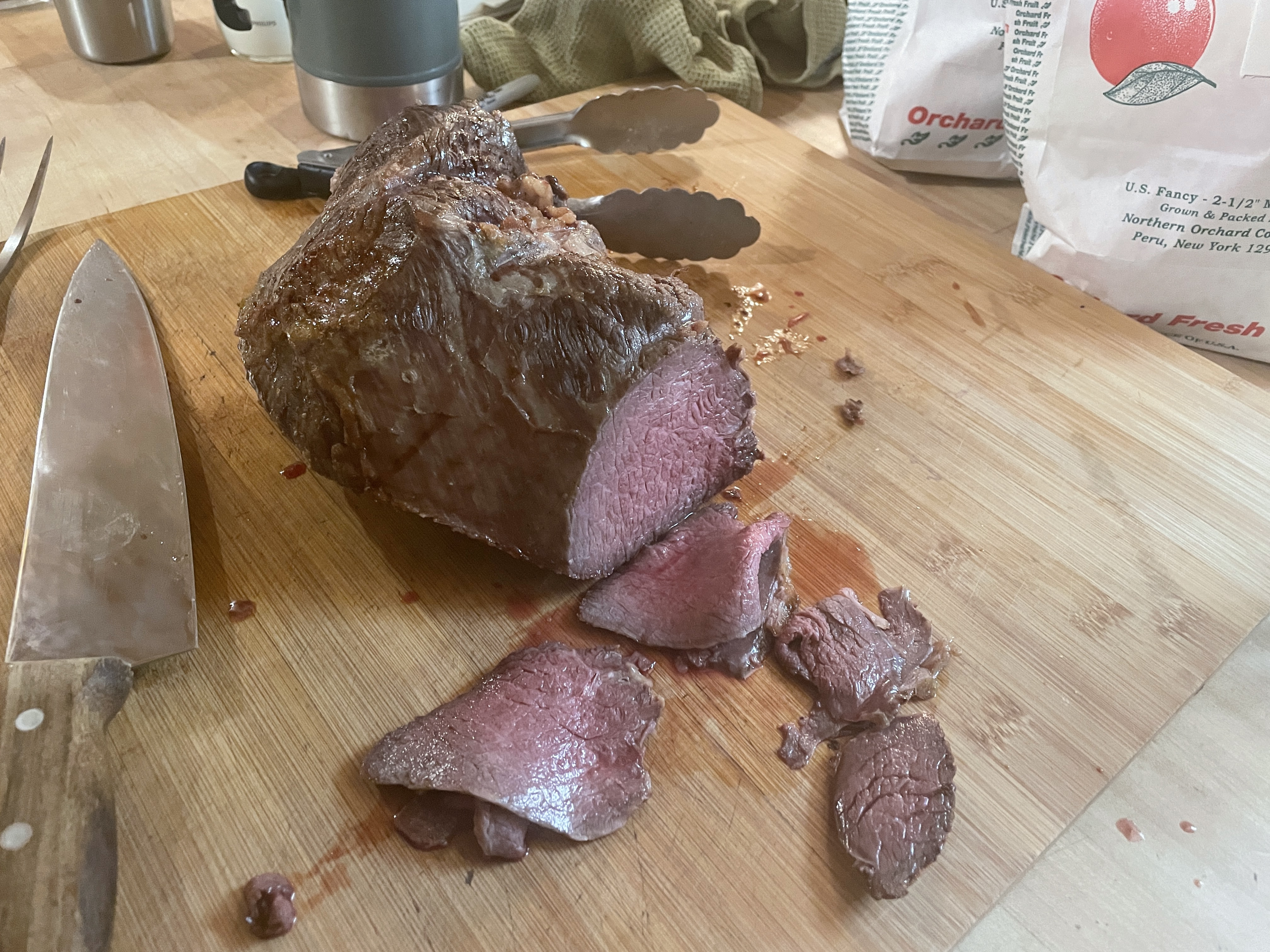 For best eating we found if we cut thin slices they were easy to eat with fingers or cut with a butter knife. The particular Sirloin Tip Roast we cooked had two muscle seams running through it. These are the dividing membranes between muscles in the animal. They are wonderful flavor but very difficult to chew when cooked like this. So after some chewing and investigating I was able to cut around them for some delicious eating. We served the roast beef with pan fried potatoes and sautéed onions, carrots and cabbage.