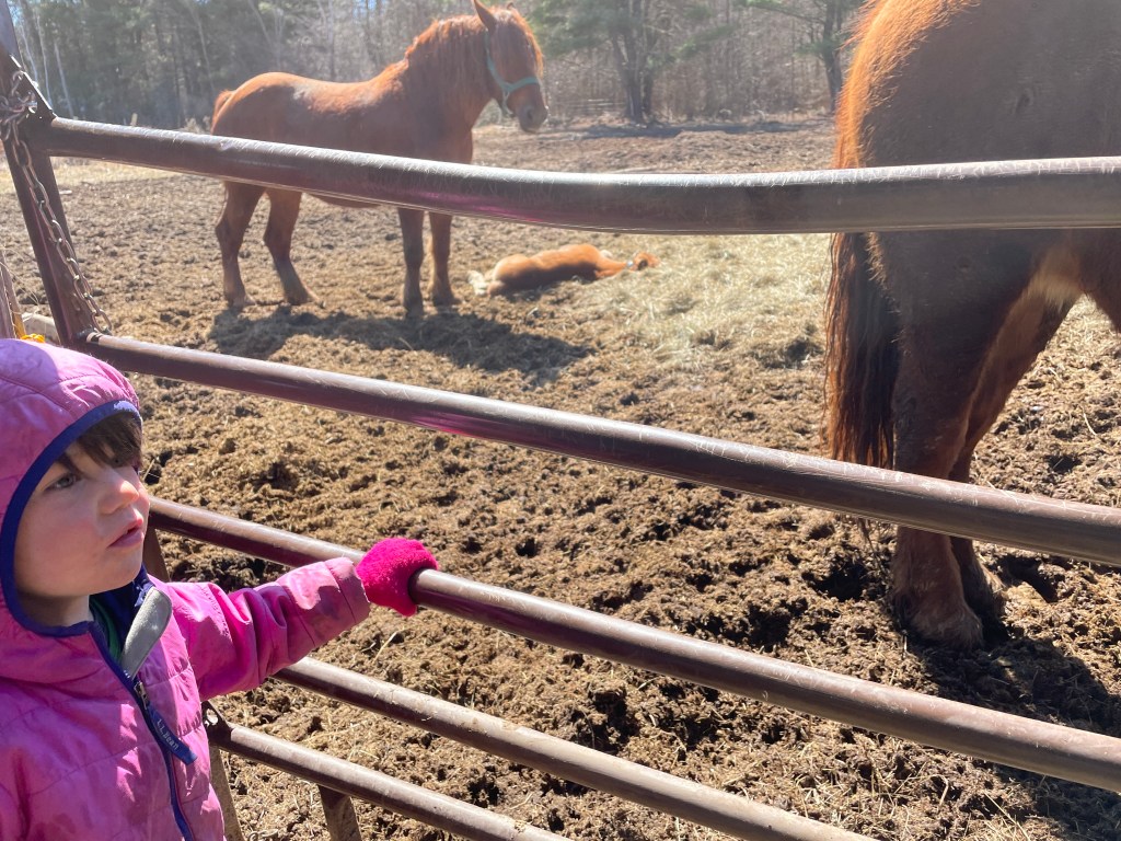After a quick parental huddle, Lovett and I headed up to the driveway to Chad and Gwen’s barn to spend some more time with the new filly. Lovett demonstrated how to grab armfuls of hay from the large haybale to feed to the mama and the baby. When only the mama came over to eat the hay, Lovett explained to me that baby horses don’t really eat hay yet, they mostly drink their mama’s milk.