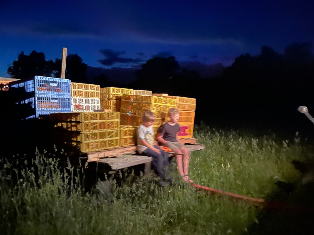By 9pm, it was getting dark and we had all the chickens in crates. Lewis and Cedar worked together to thread a ratchet strap though each crate and around the stack of crates. This was some serious teamwork and they kept up with me and Chad loading the strapped pallets onto the wagon. I was impressed at their resourcefulness and equal team dynamics. They figured out how to use a fence post to thread the strap through the pallet, gently feeling their way through the dark and meeting the waiting hand of the other to grab the strap. One of them held the strap and ratchet while the other tightened it down. All with levity and joy that was inspiring to watch and listen to.