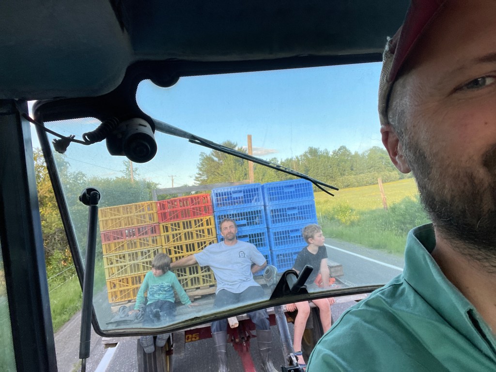 After dinner Lewis and I met Chad and Cedar to head out to the field. We were slightly delayed when Lewis noticed that the tractor was leaking hydraulic fluid. A quick trip down to the barn, a few torques on some wrenches and we were headed out to the field with a wagon load of empty crates and three content faces riding behind me. I remember the feeling the first time I rode behind a tractor on a wagon. I was much older than Lewis is now, yet I could still sense that same feeling of excitement and joy as we rode out to do our work.
