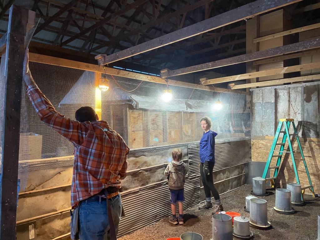 As the sky was beginning to darken we had a surprise visit from Uncle Dakin and Kristen, our old familiar housemates who have since moved to Saranac Lake. They were on their way home from an event in Westport, and they stopped into say hello and we took full advantage of Dakin’s and Kristen’s willingness to help. Just in time too! With Lewis wielding the staple gun and Dakin, Kristen and me holding up the hardware cloth we were able to put up the long run in just a few minutes. Thank you Dakin and Kristen!