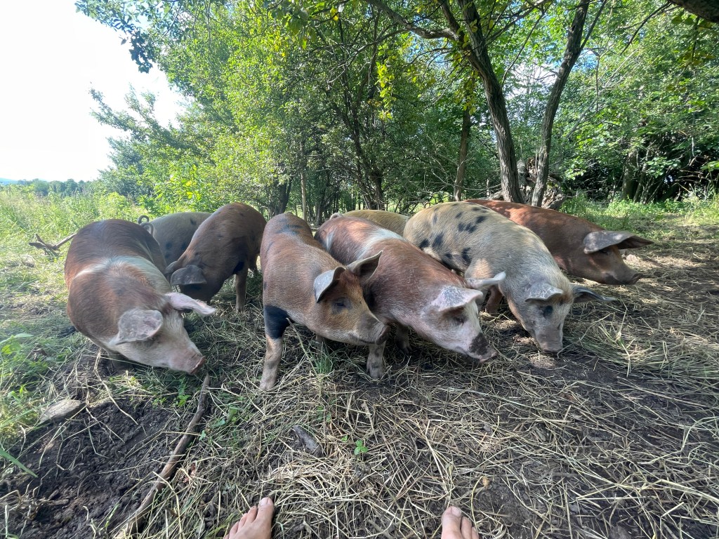 As we watched them root and sniff their way towards us we talked about how quickly pigs grow. We typically get our pigs when they are eight weeks old and have just been weaned from their mothers. They weigh in about 20-30 lbs at this age. From there they get an Organic Grain ration and all the fun things they can find on pasture like grass and legumes as well as roots and tubers in the ground, grubs and insects, nuts and so much more. In five to six months’ time those little 20 lb piglets grow to their “finished weight” of about 250-300 lbs. That is well over 1 lb per day of growth all summer long. “Can you imagine if we grew that fast?” they asked.