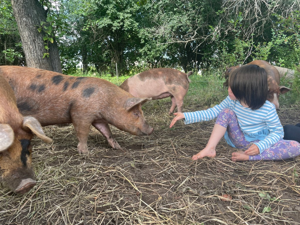 The weather this summer has been mild. Still, with the afternoon temperatures touching 80 degrees, pigs and children alike found a spot in the shade to enjoy the afternoon. We move our pigs to fresh pasture every week, but on a hot summer day the grass under the shade of a wild apple tree is worn to dirt in a short time. Who wouldn’t want to hang out under there?