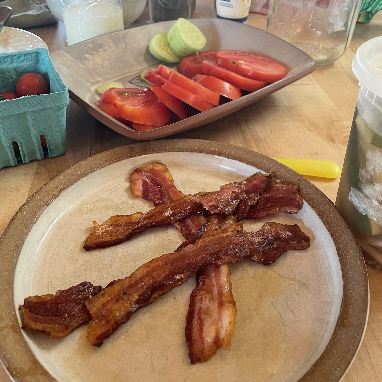 I believe the magic of a BLT is how it tastes like summer. Fresh tomatoes, mayo, bacon, cucumber slices this time around on toast was our tester meal for a new batch of bacon this week. With the storage freezer back online I was able to bring home our next batch of pork from the processor. We now have our full array of pork back in stock including the Best of Pork Box.
