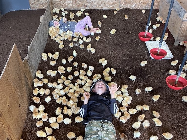 On Wednesday, Lewis, Lovett and I picked up the last batch of chicks at the post office. They love to help get the chicks, watch them peck and cheep from their boxes and then help me unload the chicks. The chicks always have such vigorous energy when they are transferred from the cramped shipping boxes to the vast plains of peat in the brooder. We call it the “zoomies” because the chicks zoom around like crazy, chasing shadows, or each other and you have to walk very slowly because they might just run under your foot! Sometimes we lie down and let the chicks climb all over us, we have to be careful because there are so many…but you can’t help but giggle.