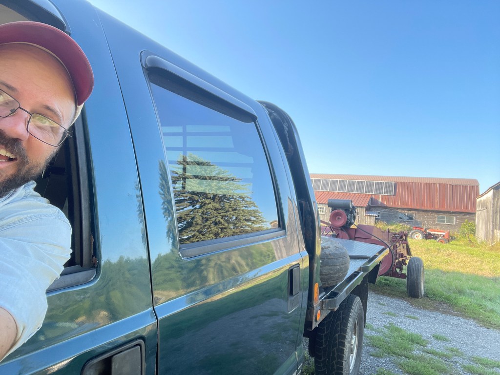 I pulled the baler down to Essex Farm with Chad’s truck, which involved scrounging a wheel off another piece of equipment, jacking the baler out of the dirt, putting on the borrowed wheel, and bumping down the road with the clank of steel and sheet metal behind me. This particular baler was our first hay baler, which came with steel wheels and an old Wisconsin engine to run the baler. Steel wheels are just what they sound like, a wheel made entirely of steel, and they make a racket going down a paved road. As I listened to the baler behind the truck I was brought back to nine years ago and our first summer making hay for our own farm. A warm afternoon, transporting the baler from our farm to Racey’s parents farm down the road and the many curious faces looking out doors and windows searching for the source of the incredible noise.