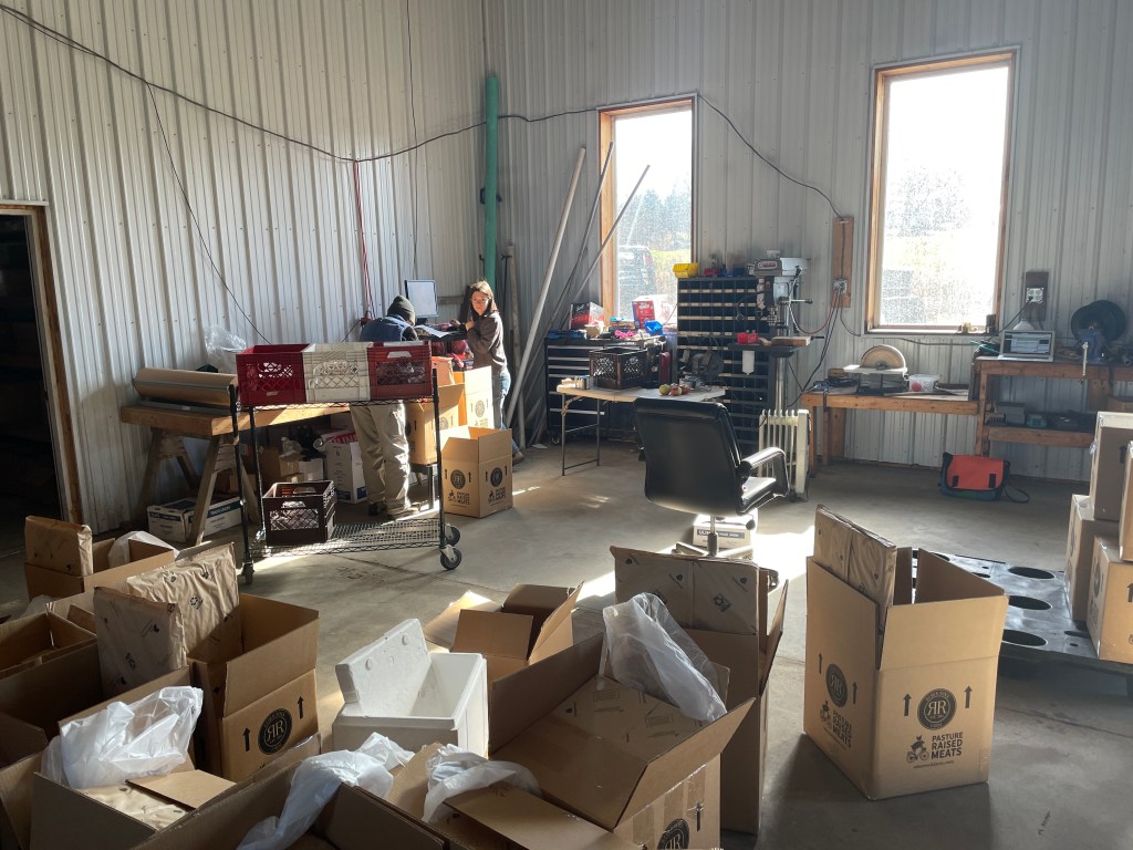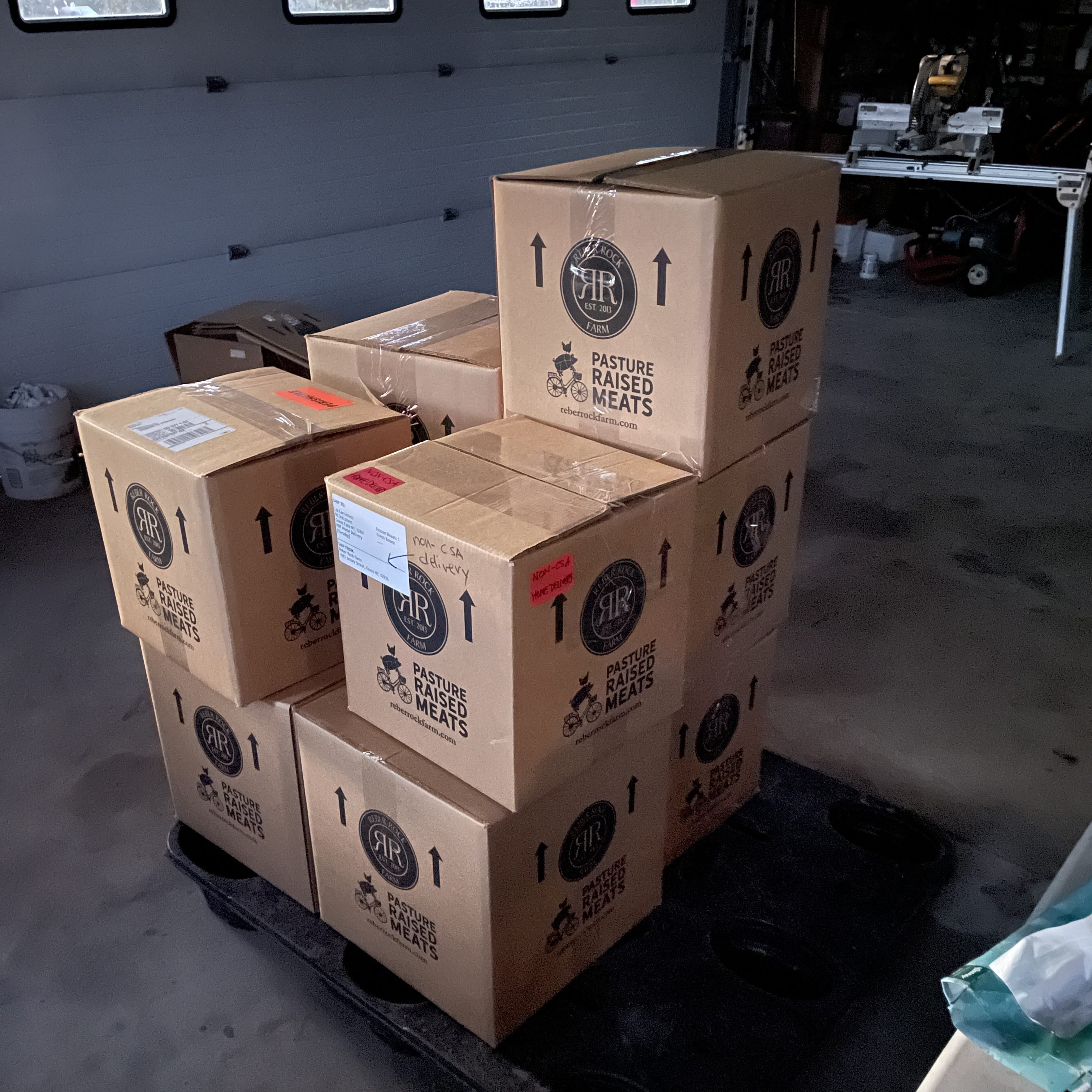We did our day-end restock, making sure we fill up each box in the pick freezer so we are ready for the following week and the pile under the blankets rapidly shrank. We packed the remaining boxes that go out later in the week back in the freezer, and were able to reduce the pile to one pallet small enough to go back in the storage freezer. Success! We went from two full pallets of overflow to a manageable one pallet that we can roll in and out of the storage freezer. Just a week ago I was planning the logistics to take a pallet to freezer storage in Vermont, and with your help we had a record breaking order packing day and made enough room in our freezers. No trip to Vermont freezer storage necessary!