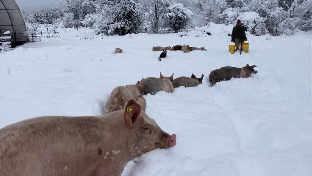 Once they heard our chuckles and noticed our movement as they peered over the banks of snow, the orderly circle game disintegrated and new paths were forged up the hill towards us. They were as orderly and single-filed as I’ve ever seen a group of pigs as I loaded up my buckets of grain and poured out breakfast. As we cleaned and filled water and forked out hay for bedding, the pigs packed down the snow and the usual porcine spontaneity resumed. Racey and I returned to the house for some snow plowing and generator setup.