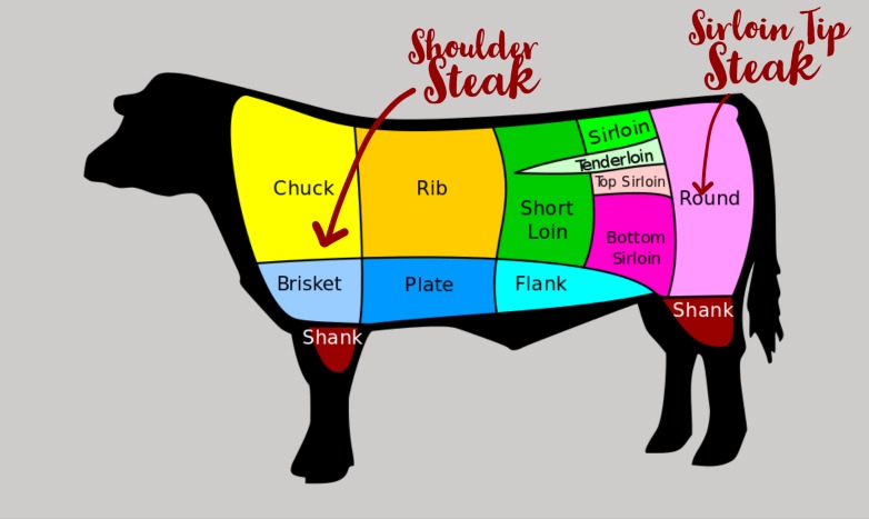 The two most common steaks to top our burritos on any given weeknight are the Beef Sirloin Tip Steak and the Beef Shoulder Steak. They are similar in character and shape, yet they come from opposite ends of the beef animal. As the name would imply, the Shoulder Steak comes from the shoulder area of the beef, where the front leg comes out of the shoulder. The Sirloin Tip however, does not come from the Sirloin! (Why we call it the sirloin tip I still don’t know…) Though a close neighbor of the Sirloin, the Sirloin Tip comes from the large group of hind leg muscles called the round.