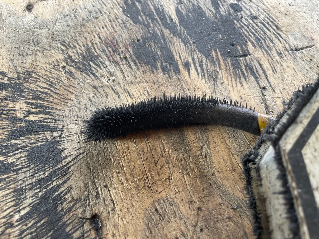 This involves lots of cutting, grinding and measuring…and some re-recutting and re-measuring:) I took this picture after a day’s work. The tool in the lower right is a magnetized holder. I loved the hairy geometry of the metal dust and shards attracted to the handle of the pliers under the magnet.