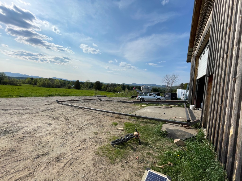 Our first task is to build the metal frame, which provides rigidity so we can easily pull the coop forward each day. We have four coops to build this spring, so we spent this week cutting and preparing all the pieces of the frames.