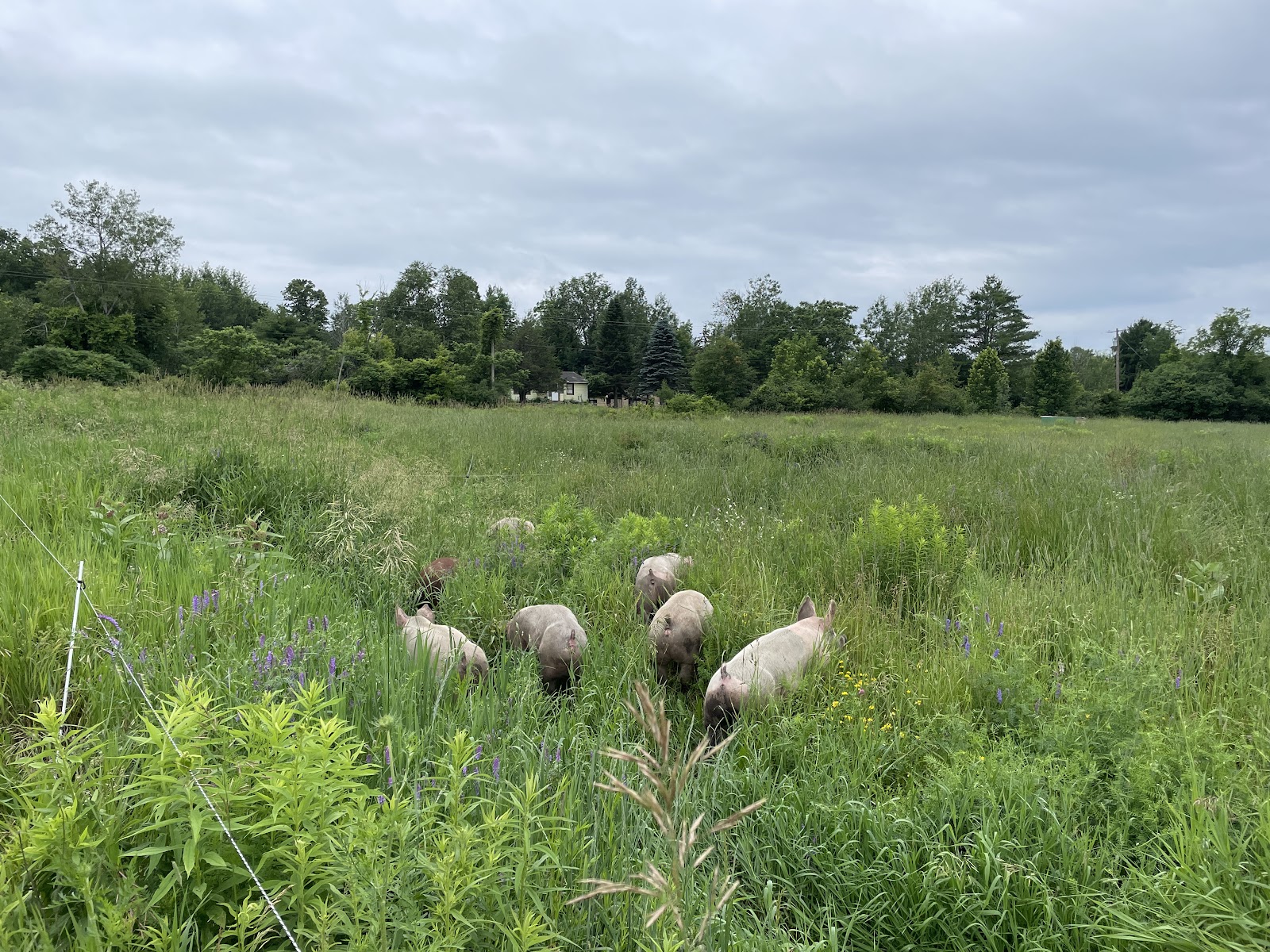 Our group of pigs on pasture have been enjoying the frequent rains to keep their mud wallows moist and the ground soft enough to root. During a dry summer, the ground gets so hard they cannot root in the pastures and we will intentionally water part of the pasture so they can root.