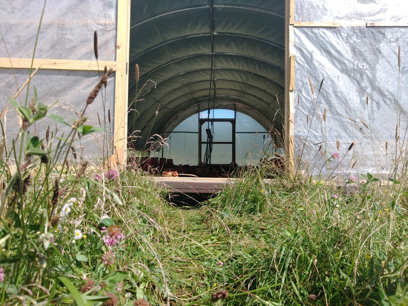 However, as the rains kept coming in the fields got wetter and wetter we began to appreciate the thick thatch of grass that the coop pushes down as it moves forward. The chickens happily hop on top of the now thick matt of downed grass to peck at bugs and grass leaves. We now fondly refer to this process as “auto mulch.”