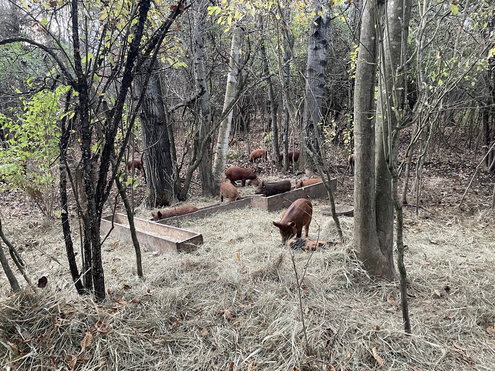 On that cold morning with snow you could not see nor ear nor snout of them; they were all buried in the hay bedding. The piglets will make their way over the next few weeks through the woods back to our “Solar Barn” where they will have plenty of dry bedding and shelter from the winter weather. In the meantime they are enjoying all the treats the forest floor has to offer.