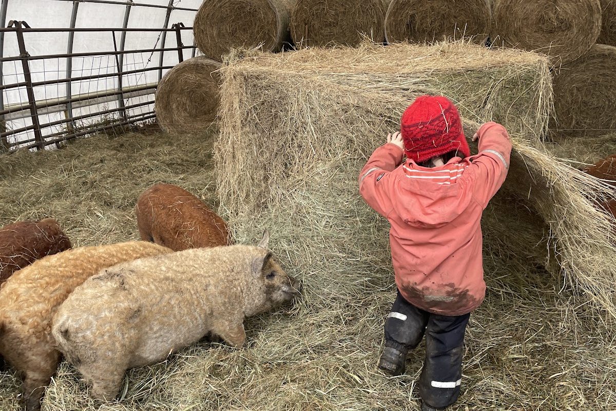 Lovett loves the pigs and helped me get down a bale and spread out some hay.