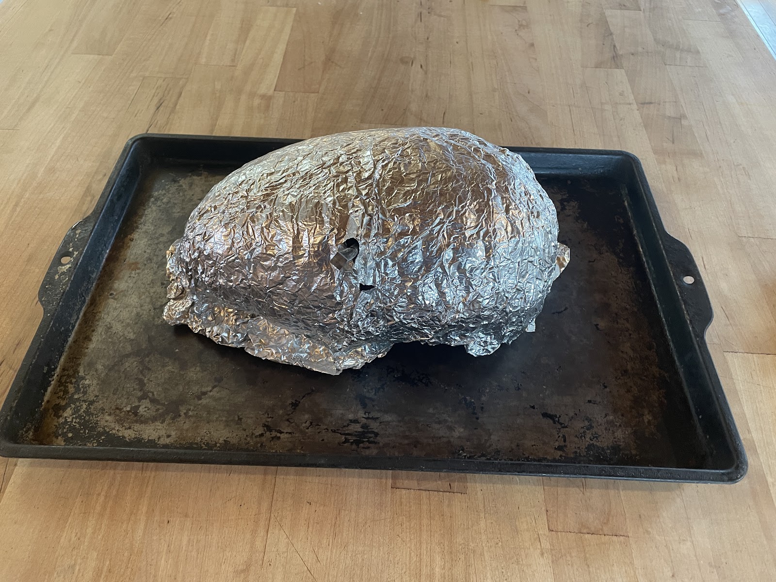 - Wrap the roast in tin foil and place on a baking sheet. (I found very little liquid was released and the cookie sheet with low sides worked just fine)