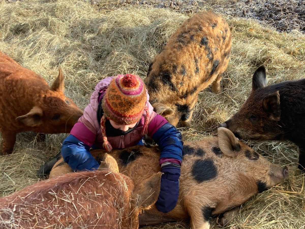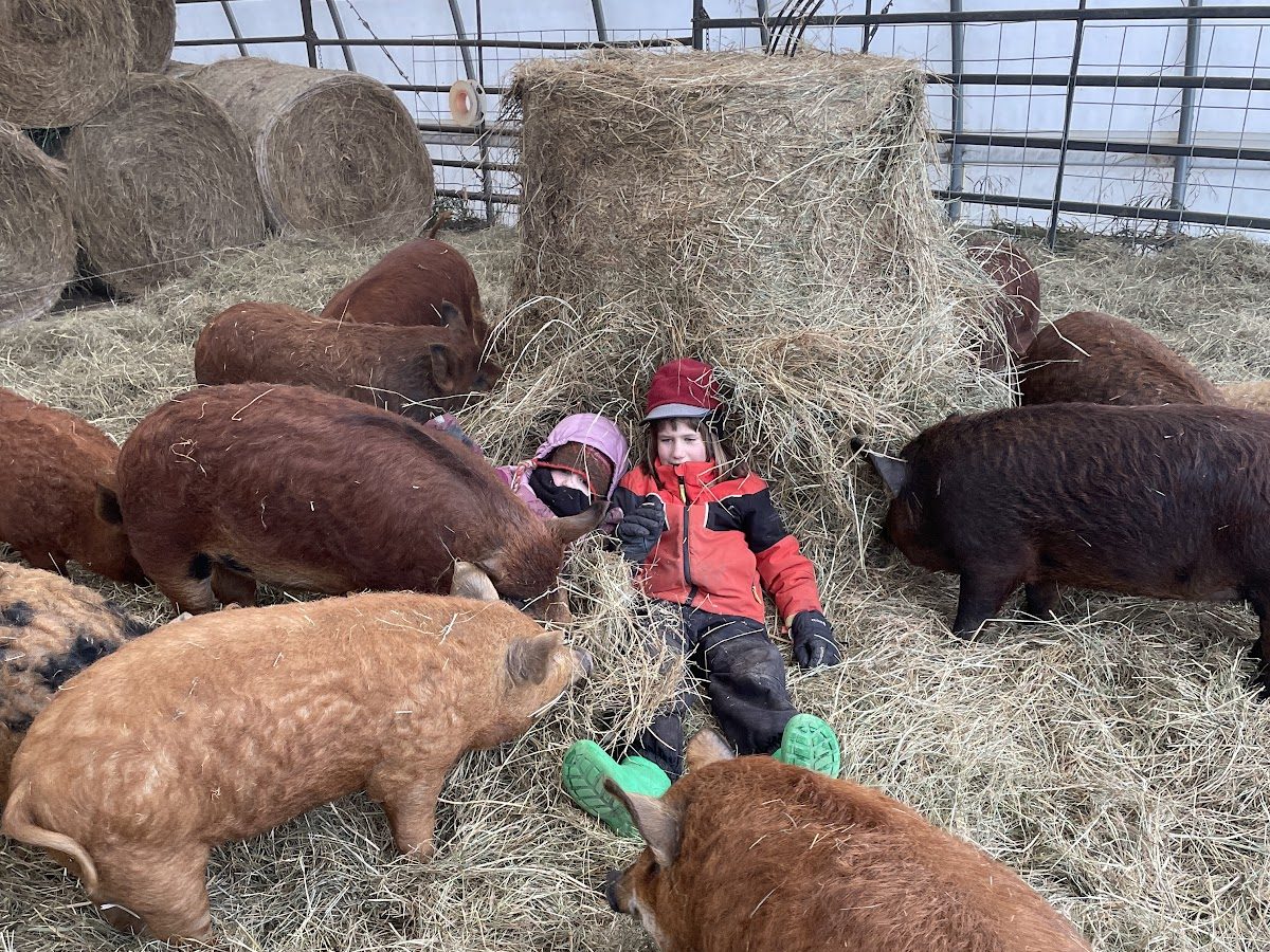 The pigs love playing in the hay, moving it around to make a comfy bed, chewing it, and occasionally plopping it on the small humans who happen to be right there.