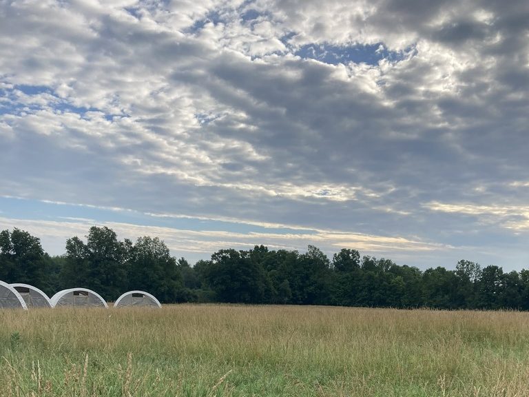 With 4” of rain in this flat field with clay soils there was plenty of standing water after the heavy rain. Yet the chickens hardly noticed since any puddles are covered by the thatch of grass that is pushed down by the coops. The chickens still have plenty of fun pecking bugs and such from the tall grass and they easily forage on the leaves and seeds. The tall grass lays down, providing a mat of sorts that means the wet weather and pecking chickens do not generate the same mud and uncomfortable conditions that shorter grass pastures have in the past.